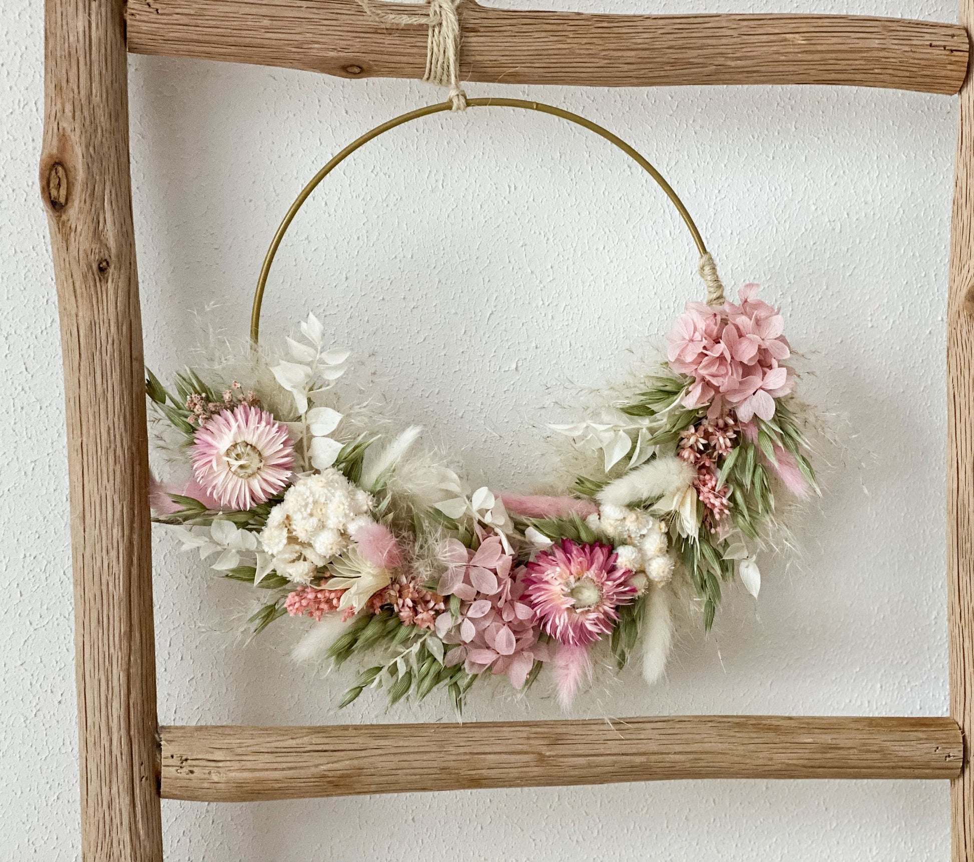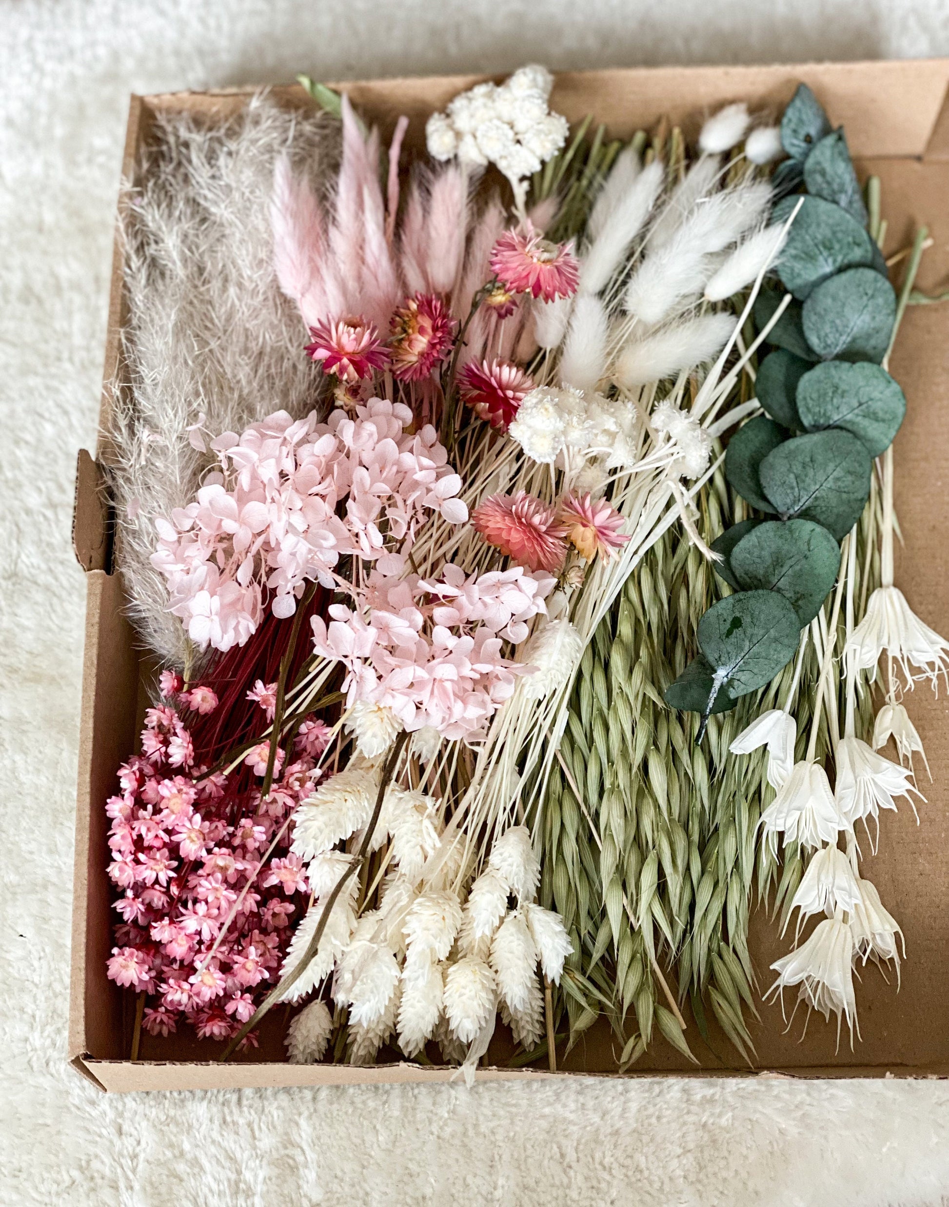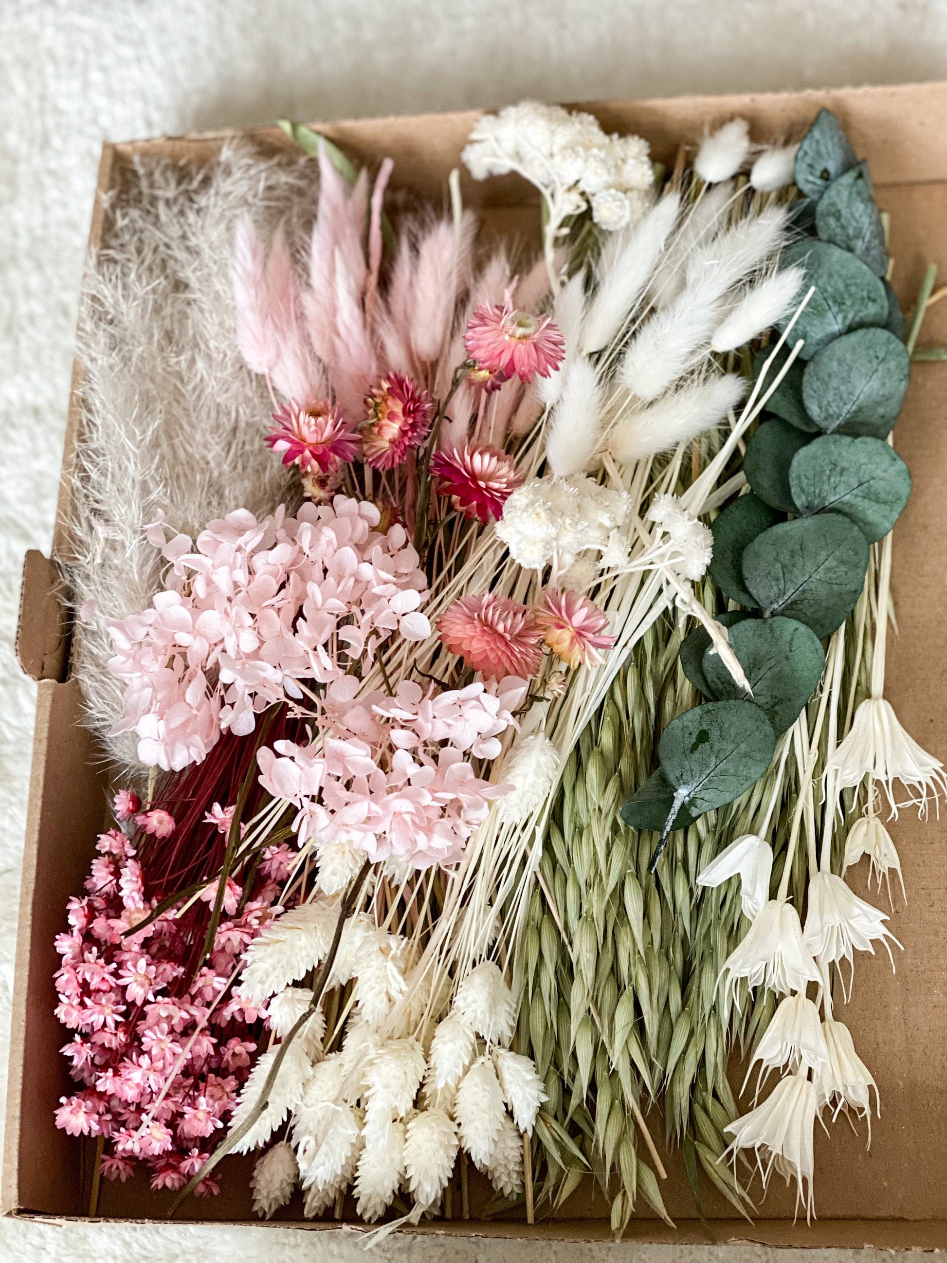 DIY Trockenblumen DIY-Set „rosa Blumenwiese“, DIY-Trockenblumenstrauß, Trockenblumenkranz in Rosa, Weiß, Grün