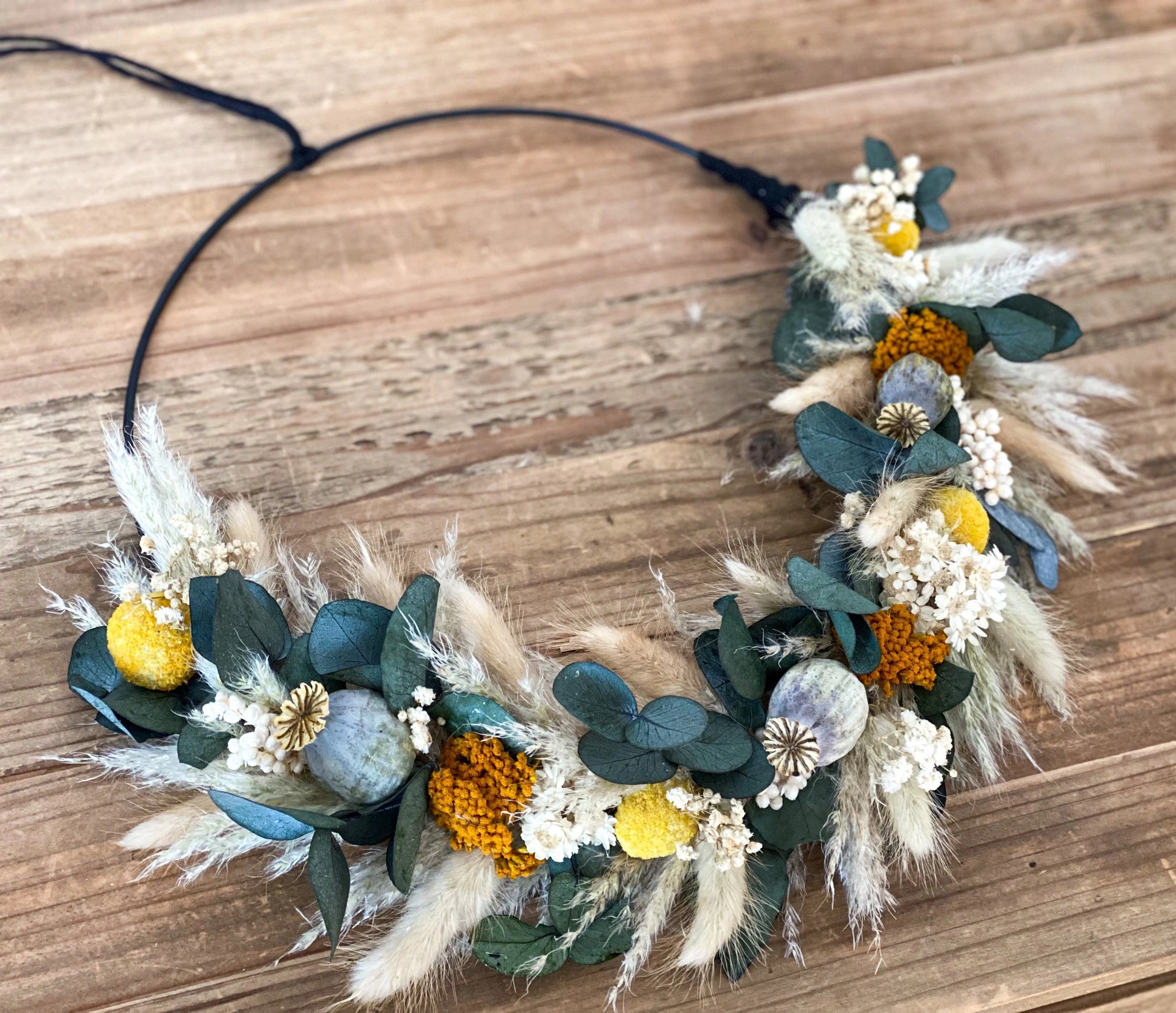 Trockenblumenkranz in Beige, Weiß, Gelb, Orange mit Eukalyptus Türkranz mit Pampasgras, Mohn, Lagurus, Phalaris, Nigella