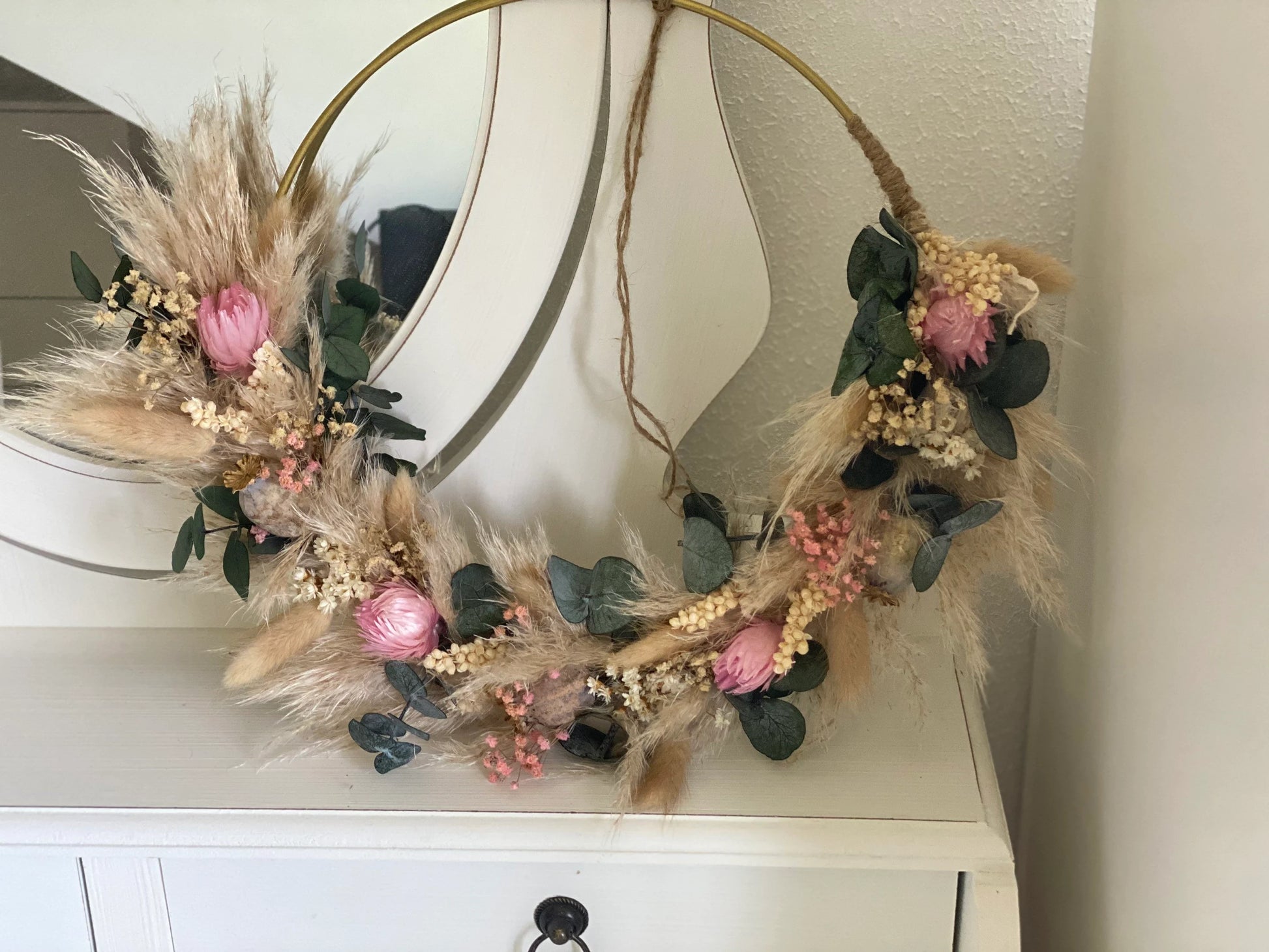 Kranz aus Trockenblumen. Als Türkranz oder Wohnzimmerdekoration bzw Wandbehang. Ein schönes Geschenk. Die Farben des Kranzes sind Beige, Rosa und grünem Eukalyptus. Mit Pampasgras, Mohn, Nigella, Lagurus , Glixia und Schleierkraut.